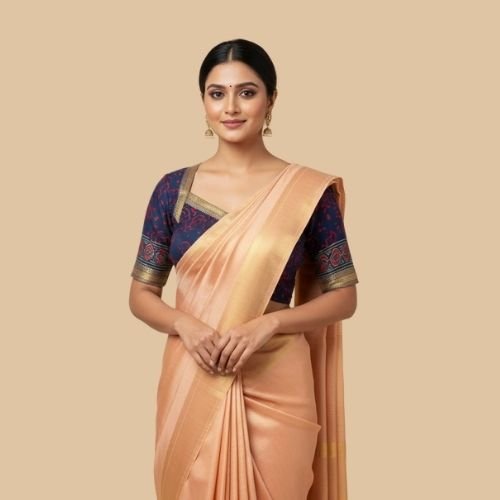 “Blouse with deep red motifs and a gold zari lining, classy Vneck front”